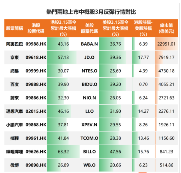 下表为热门港美两地上市中概股3月以来的反弹行情。