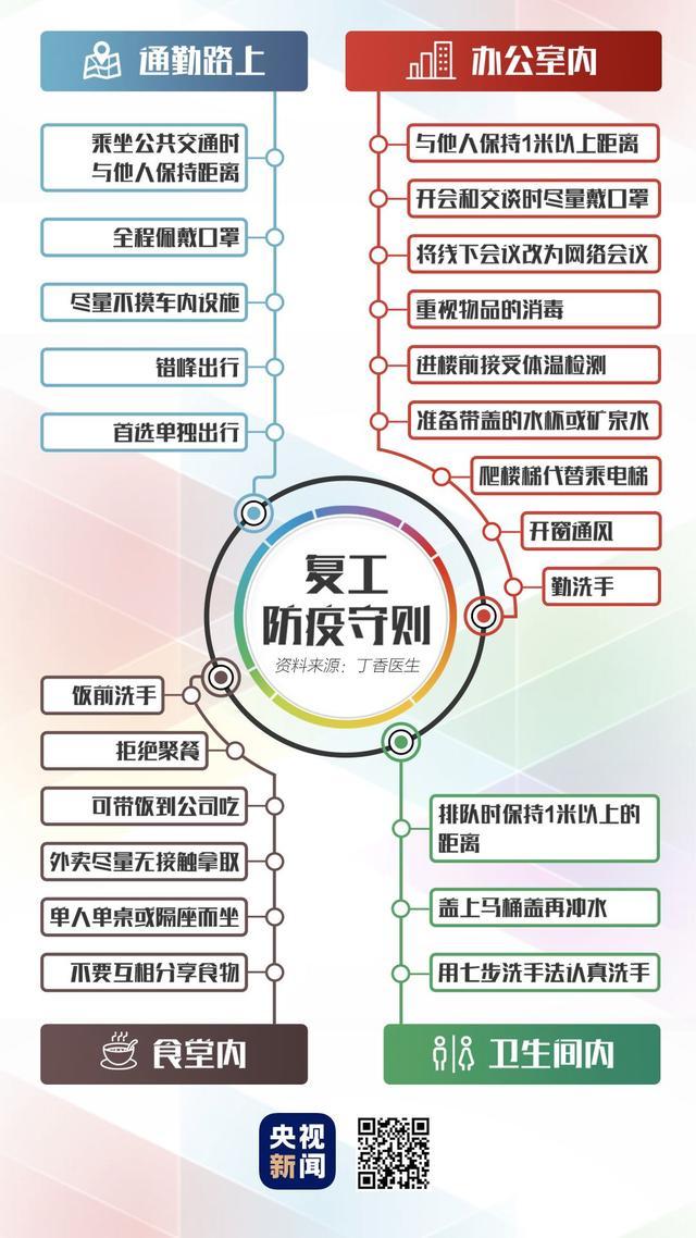 本周,不少人已开启节后复工模式 通勤路上如何防护? 办公室里要注意哪些细节? 在食堂用餐应规避哪些风险? 收好下面这份复工防疫守则 关键信息一目了然↓↓↓ 防护做到细处 对自己负责 也对同事和他人负责