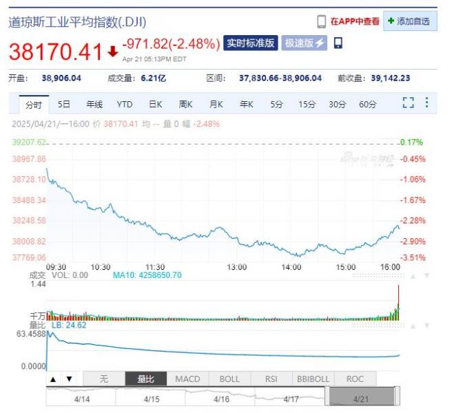 一、美股股市:道琼斯指数下跌971.82点,跌幅2.48%,报38170.41点;标普500指数下跌124.50点,跌幅2.36%,报5158.20点;纳斯达克综合指数下跌415.55点,跌幅2.55%,报15870.90点。特斯拉(TSLA.US)跌5.7%,苹果(AAPL.US)跌近2%,英伟达(NVDA.US)跌4.5%。费城半导体指数收跌2.10%,报3751.91点。纳斯达克中国金龙指数逆势收涨0.2%,阿里巴巴(BABA.US)涨1%,蔚来汽车(NIO.US)涨2%。