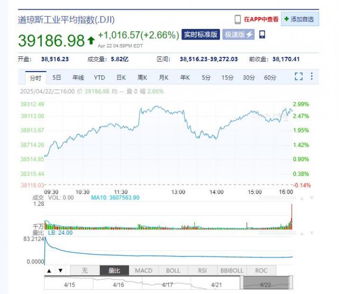 一、美股股市:道指涨1016.57点,涨幅为2.66%,报39186.98点;纳指涨429.52点,涨幅为2.71%,报16300.42点;标普500指数涨129.56点,涨幅为2.51%,报5287.76点。特斯拉(TSLA.US)涨4.6%,英伟达(NVDA.US)涨2%,苹果(AAPL.US)涨3.4%。纳斯达克中国金龙指数收涨3.69%,阿里巴巴(BABA.US)涨5.2%。