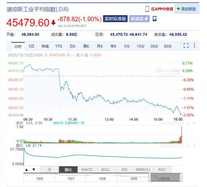 2025年10月13日星期一,以下是由亚汇网整理的昨夜今晨国际财经要闻汇总: 国际股市 一、美股股市:道指跌878.82点,跌幅为1.90%,报45479.60点;纳指跌820.20点,跌幅为3.56%,报22204.43点;标普500指数跌182.59点,跌幅为2.71%,报6552.52点。纳指、标普500指数创4月10日以来最大单日跌幅。大型科技股