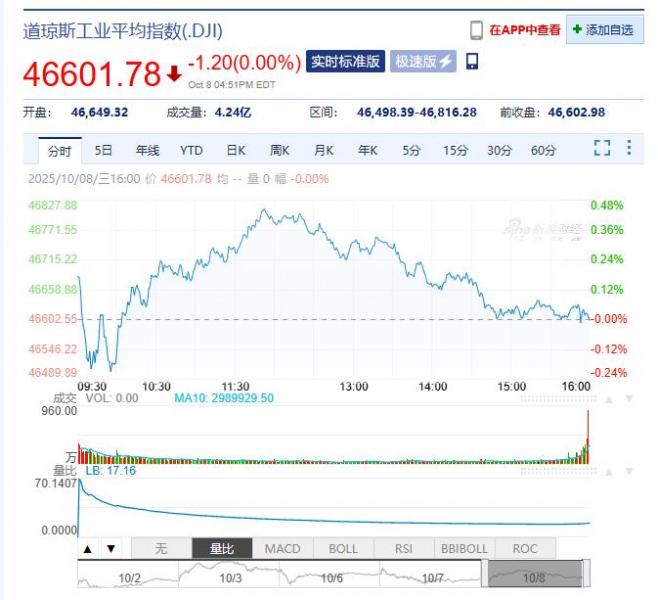 2025年10月09日星期四,以下是由亚汇网整理的昨夜今晨国际财经要闻汇总: 国际股市 一、美股股市:道指收平,报46601.78点;纳指涨255.02点,涨幅为1.12%,报23043.38点;标普500指数涨39.13点,涨幅为0.58%,报6753.72点。AD(AD.U)涨11.3%,创下历史新高,总市值超3800亿美元。英伟达(NVDA.U)涨2.2