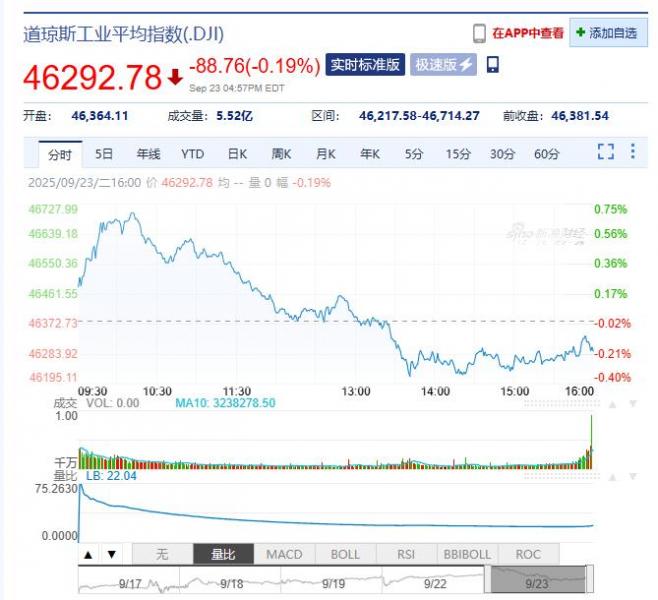 2025年09月24日星期三,以下是由亚汇网整理的昨夜今晨国际财经要闻汇总: 国际股市 一、美股股市:道指跌88.76点,跌幅为0.19%,报46292.78点;纳指跌215.50点,跌幅为0.95%,报22573.47点;标普500指数跌36.83点,跌幅为0.55%,报6656.92点。英伟达(NVDA.U)跌近3%,甲骨文(ORCL.U)跌4.3%,台积电(