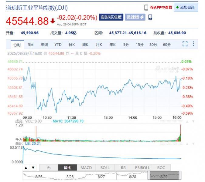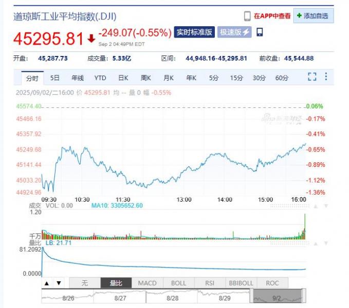 2025年09月03日星期三,以下是由亚汇网整理的昨夜今晨国际财经要闻汇总: 国际股市 一、美股股市:道指跌249.07点,跌幅为0.55%,报45295.81点;纳指跌175.92点,跌幅为0.82%,报21279.63点;标普500指数跌44.72点,跌幅为0.69%,报6415.54点。英伟达(NVDA.U)收跌1.95%,CorWav(CRWV.U)收跌9.41%。