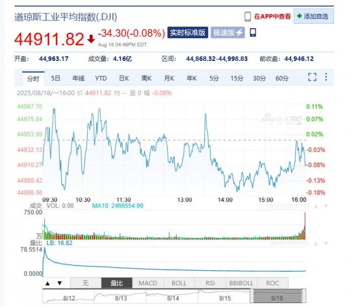 2025年08月19日星期二,以下是由亚汇网整理的昨夜今晨国际财经要闻汇总: 国际股市 一、美股股市:道指跌34.30点,跌幅为0.08%,报44911.82点;纳指涨6.80点,涨幅为0.03%,报21629.77点;标普500指数跌0.65点,跌幅为0.01%,报6449.15点。科技股巨头ta(TA.U)与微软(FT.U)分别下跌2.3%和0.6%,令大盘