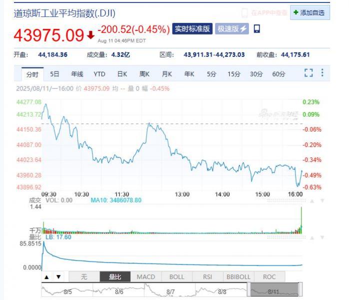 2025年08月12日星期二,以下是由亚汇网整理的昨夜今晨国际财经要闻汇总: 国际股市 一、美股股市:道指跌200.52点,跌幅为0.45%,报43975.09点;纳指跌64.62点,跌幅0.3%,报21385.4点;标普500指数跌16点,跌幅为0.25%,报6373.45点。C3.ai(AI.U)收跌25.6%,英特尔(INTC.U)涨3.51%,英伟达(NVDA.U