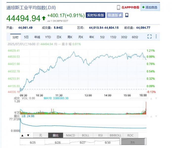 2025年07月02日星期二,以下是由亚汇网整理的昨夜今晨国际财经要闻汇总: 国际股市 一、美股股市:道指涨400.17点,涨幅为0.91%,报44494.94点;纳指跌166.84点,跌幅为0.82%,报20202.89点;标普500指数跌6.94点,跌幅为0.11%,报6198.01点。英伟达(NVDA.U)跌近3%,Circl(CRCL.U)涨超6%,特斯拉(TLA