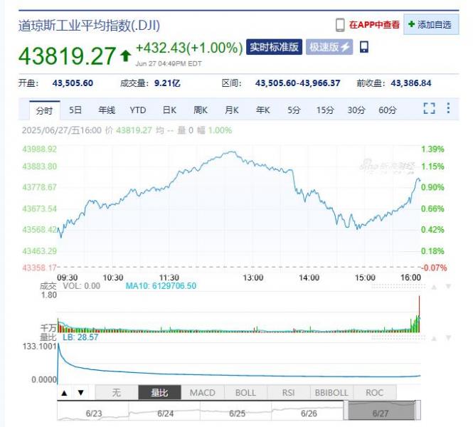 2025年06月30日星期一,以下是由亚汇网整理的昨夜今晨国际财经要闻汇总: 国际股市 一、美股股市:道指涨432.43点,涨幅为1.00%,报43819.27点;纳指涨105.55点,涨幅为0.52%,报20273.46点;标普500指数涨32.05点,涨幅为0.52%,报6173.07点。英伟达(NVDA.U)收涨1.76%,亚马逊(AZN.U)涨2.85%。纳斯