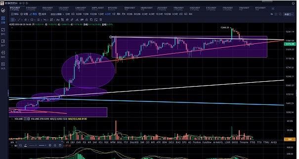 比特币目前在周线上处于上涨过程中的沙僧位,这个位置更多的是看震荡。在4小时级别上比特币运行出了一个上边线为水平的收敛结构,这是一个看空的结构,空头目标位于箱体下边线即11150美金附近。同时在收敛上边线12000和箱体上边线12100区间是高位做空的较好点位。
