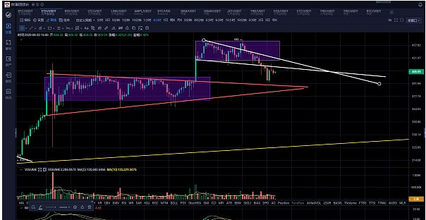 同样处于周线上涨沙僧位的ETH在4小时级别上形成了方向向下的收敛,在中间位置跌破收敛后,有机会向420美金附近进行反弹,然后继续围绕420-410区间震荡向下。注意这个向下的收敛在进行到近末端时是有机会出现反弹的,时间是在8.23日前后,如果以太坊价格在404美金附近是有机会反弹至433美金。
