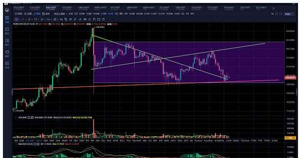 注意BSV的大开口收敛正在向箱体结构运行,这样我们很容易找到箱体底边线和前上涨趋势线在200美金附近的支撑位,但注意这是个很容易发生插针行情的点位,因此建议在可能的插针位置即189美金附近埋伏多单。