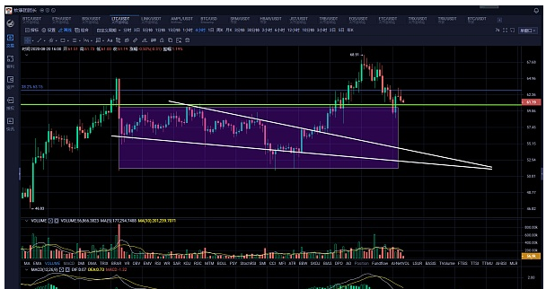 LTC在日线级别上涨西游完成之后做出了小时线下跌西游的回调动作,已经完成了这轮上涨在时间级别和方向的切换。当前行情的重点支撑是61美金,重点缠绕的点位是63.15美金,因此我认为在61.5美金附近埋伏多单能够在65.5美金附近获利了结。
