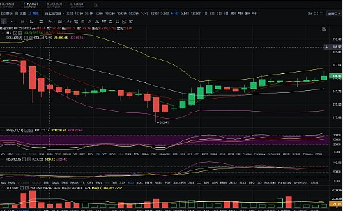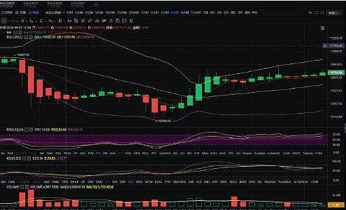 四小时线来看,布林轨道开始向内缩口,MACD多头处于一个缩量状态,快慢线运行在零轴上方平行,RSI运行在合理区间逐渐走平,KDJ三线目前有合拢态势,目前大饼处于一个高位盘整状态,预计白盘震荡走低可能性较大。日内操作思路 低多为主 高空为辅 操作建议:回踩 10700附近多单入场 止损10600 目标上看10900-11100反弹 10850附近空单进场 止损10950 目标下看10700-10600ETH行情分析:4小时看以太价格冲高到上轨360后遭遇压制,持续回落,技术上MACD指标金叉红色动能持续缩量,KDJ三线聚合向上发散运行,早间行情预计短期继续上走可能 1小时看布林带缩口运行,以太价格跌至下轨后受到支撑,MACD金叉红色开始放量,KDJ三线有聚拢的迹象开始平行运行,短期行情预计先走震荡蓄力,操作上建议回踩做多即可。