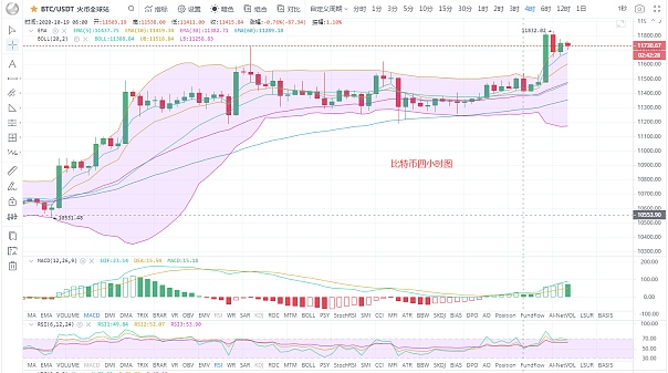 昨日BTC如期向上展开放量突破,最高触及11832,今日走势BTC冲高后在凌晨稍有回落,4小时线上看布林带呈开口向上,均线发散向上,币价在上方运行,MACD持续0轴上方金叉运行,日线图上BTC在经过两个小阳之后,昨日最终收出大阳结尾,走势上来看,价格在接连打破阻力位置后目前短期走势保持偏强格局,日内有回测下方关键支撑的动能,综合来看,目前大家需要谨防一下行情冲高回落,上方需要关注11900阻力是否有效,下方需要关注11500一线。