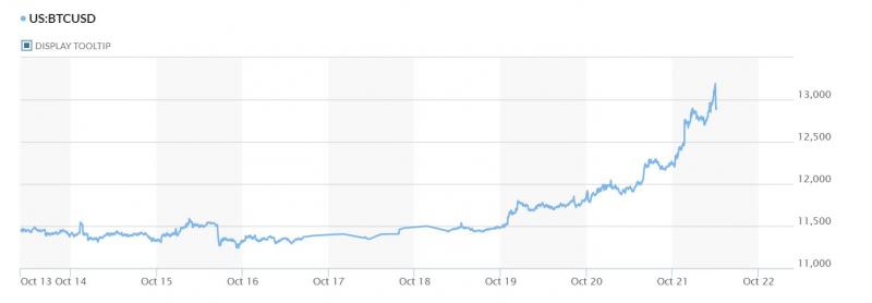 周三(10月21日),自PayPal(贝宝)宣布将允许客户使用加密货币以来,比特币价格自2018年以来首次突破1.3万美元。