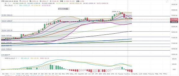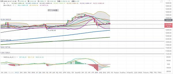 短周期1小时图中,经过昨日瀑布,布林带再度打开,今日凌晨至目前,行情还是属于区间盘整期间,上方短期压制位在13327一线,其次13422一线。今日区间盘整后看反弹,如果行情不能企稳13422上方,行情会再度回落。可结合以太坊行情进行具体分析,以太坊行情在下一篇。