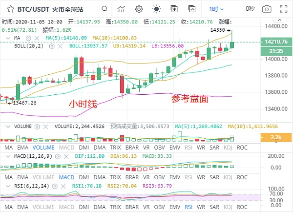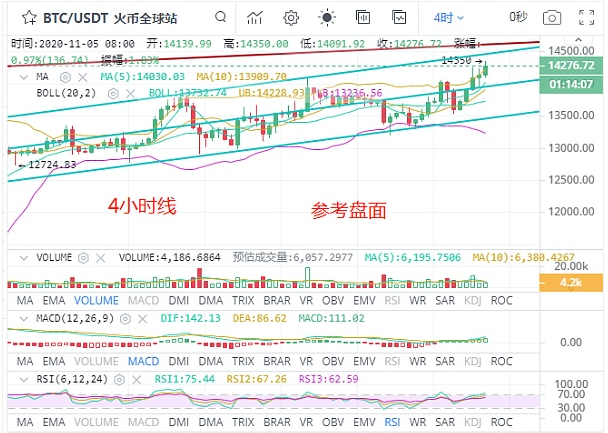 四小时线,K线四连阳走势,MACD快慢线位于0轴上方呈金叉形态向上,多头量能短期内有所增强,RSI与KDJ指标位于60与70上方强势区运行。目前上方并无强力压制位,后续行情走势关注M国落票结果。如果币价能企稳14000上方,即可上看15000一线。