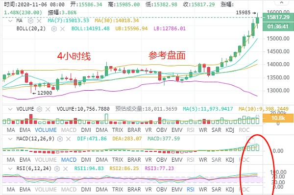 不管从那个级别图来看,目前币价处于一个最新的区间内,并且明显的看到当下多头只能用十分强势来形容。四小时K线一直走阳线,现以10连阳。当前布林带呈一个张口状态向上扬开,价格在布林带中轨上方持续运行。加上上方破指标太多,容易受消息面影响,随时会受利空消息迎来砸盘。附图指标可见:MACD多头能量柱还在不断放量,MACD快慢线在5轴上方呈现且拐头向上的姿态,KDJ在80水平线上方呈现上行姿态,所以操作上顺势而为,回调做多为主。