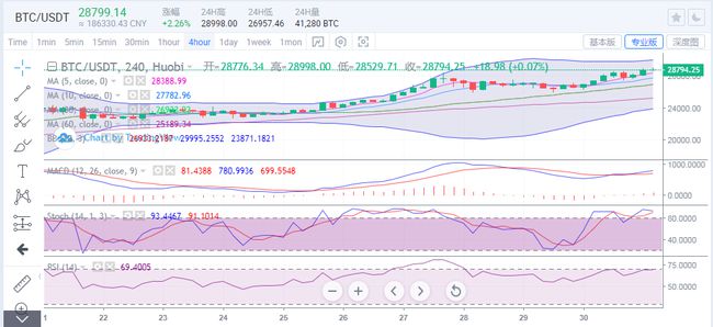 比特币昨日冲高回落,高位触及28597位置,日内凌晨价格再次上探,再刷历史新高,高位触及28998位置,未能在上方企稳,价格承压下行,目前运行在28790附近