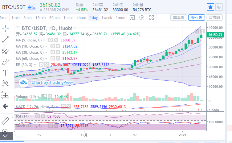 比特币昨日涨幅4000点,新高之后虽然出现深度回调,但是后续修复力度强劲,整体上行趋势斌并未改变。日内凌晨走势延续上行,价格是再度攀升刷新历史高位点,目前行情如期上涨至36000区域,多头情绪浓重,日内价格有进一步上行的趋势。
