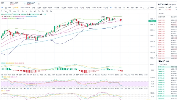 日线图中,当前K线已经接连两日收阴,行情多次向布林带的中轨展开试探都未将其破位,最低仅落于55402点位,可是多方量能并未得到复苏,反而显得更为疲软;今日行情受其上方五日均线和十日均线的双重压制之下出现了大幅回落,不仅将其55000的强力原支撑点破位,还一再向下寻找新的支撑力量,而下方的30日均线附近53000点位成了当前的支撑位置。而此时,我们再顺势做一波空单也是比较稳妥的。