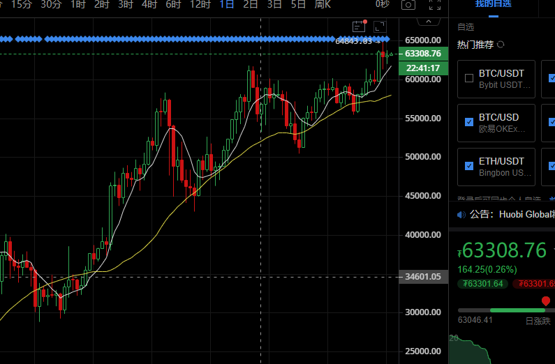 比特币不会一直走单边,从昨日的行情就可以看出,我们先看日K线已经开始从布林带上轨(63165)回落,KDJ开始收口,有向下交叉趋势,MACD顶背离缩量,DIF和DEA高位发散示弱,均线MA没有大的变动