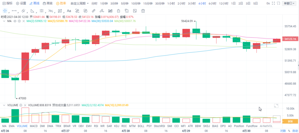 从短期小时线上看,布林带开口线下运行,虽然凌晨币价在52336一线走出反弹,向上突破MA5,MA10压制,但是当下币价运行至布林带中轨再次承压,若日内不能打破这一僵局,比特币有很大可能会继续走空,下方关注支撑52300一线。日内还是建议操作上以空为主,以多为辅。