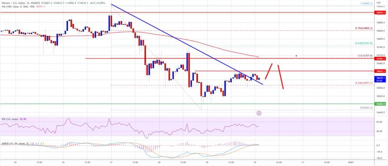 如果比特币未能在16700美元的阻力位上方开始复苏浪潮,它可能会开始另一次下跌。下行的直接支撑位在16450美元或近期低点附近。