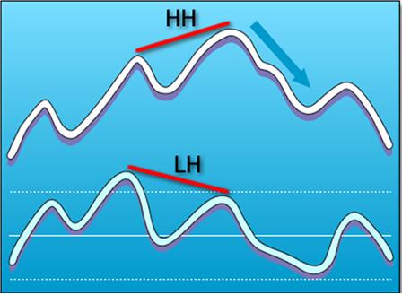 现在,如果汇价形成一个更高的高点(HH),但是震荡指标却形成一个更低的高点(LH),那么,我们就会看到常规空头背离的形成。