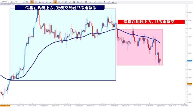 如下图所示,在英镑/美元4小时图上,我们可以运用55周期的均线作为趋势筛别。如果价格处在该均线上方,那么交易者操作时仅仅做多,而如果价格处在均线下方,那么只考虑做空。