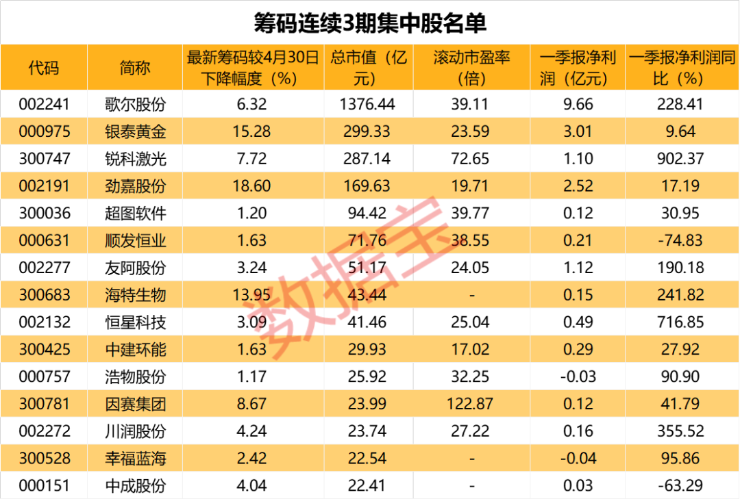 筹码连续3期趋于集中(4月30日、5月10日、5月20日、5月30日)下降的有15只。其中中成股份筹码连续5期集中,中建环能筹码连续4期集中,恒星科技连续9期集中。