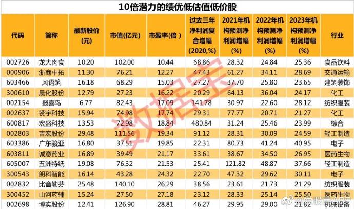 如何捕捉投资机会想必是投资者更关心的问题。跌幅较大、涨幅较高股具备哪些特征?特征一:小市值股票股价跌幅大。特征二:传统行业股价跌幅较高,大消费、大金融行业涨幅较高。特征三:估值高个股泡沫大。特征四:投资回报率低个股跌幅较大。特征五:高价股下跌概率较大。根据综合条件:上市半年以上,最新股价低于30元,市值低于200亿,最新估值30倍以下,过去三年净利润复合增速低于20%,2020年、2021年一季度净资产收益率分别超过10%、5%,机构预测2021年至2023年净利润增幅均超过20%。经筛选仅有15股入选,包括风语筑、诚意药业、比音勒芬、吉宏股份、龙大肉食。