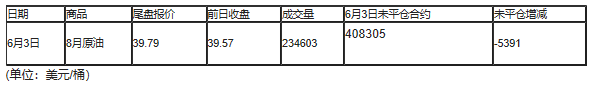 截至北京时间05:15,6月3日伦敦洲际交易所(ICE)2020年8月原油成交量为234603,布伦特期货原油6月3日未平仓合约减少5391手。