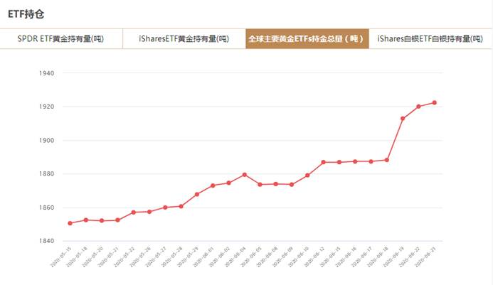 截至2020年6月23日,全球8大黄金TF持仓总量为1922.438吨,与上一交易日增加2.265吨。