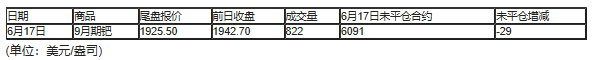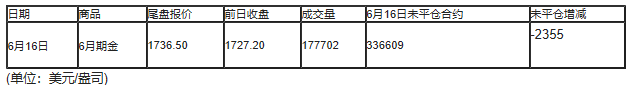截至北京时间04:59,6月16日纽约商品交易所(COX)6月期金成交量为177702,6月16日未平仓合约减少2355手。
