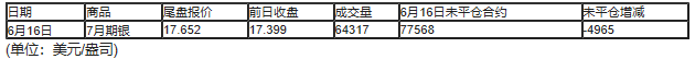 截至北京时间04:59,6月16日纽约商品交易所(COX)2020年7月期银成交量为64317,6月16日未平仓合约减少4965手。
