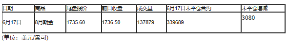 截至北京时间04:59,6月17日纽约商品交易所(COX)8月期金成交量为137879,6月17日未平仓合约增加3080手。