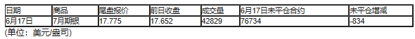 截至北京时间04:59,6月17日纽约商品交易所(COX)2020年7月期银成交量为42829,6月17日未平仓合约减少834手。