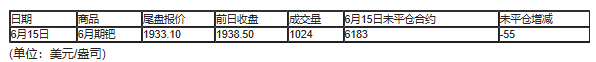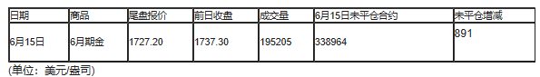 截至北京时间04:59,6月15日纽约商品交易所(COX)6月期金成交量为195205,6月15日未平仓合约增加891手。