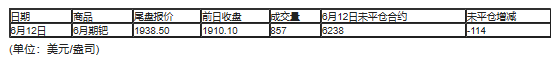 截至北京时间04:59,6月12日纽约商品交易所(COX)6月期金成交量为148176,6月12日未平仓合约增加2956手。