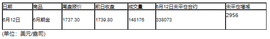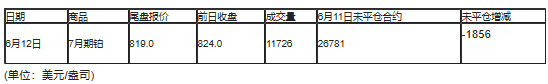 截至北京时间04:59,6月12日纽约商品交易所(NYX)2020年8月期铂成交量为11726,6月12日未平仓合约减少1856手。
