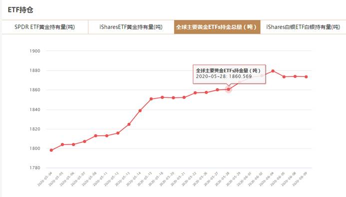 截至2020年6月9日,全球8大黄金TF持仓总量为1873.6吨,与上一交易日减少0.277吨。