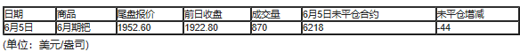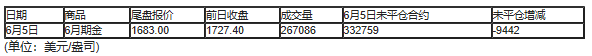 截至北京时间04:59,6月5日纽约商品交易所(COX)6月期金成交量为267086,6月5日未平仓合约减少9442手。