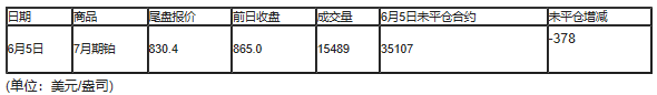 截至北京时间04:59,6月5日纽约商品交易所(NYX)2020年7月期铂成交量为15489,6月5日未平仓合约减少378手。