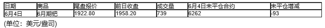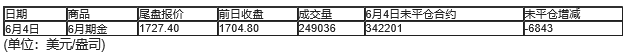 截至北京时间04:59,6月4日纽约商品交易所(COX)6月期金成交量为249036,6月4日未平仓合约减少6843手。