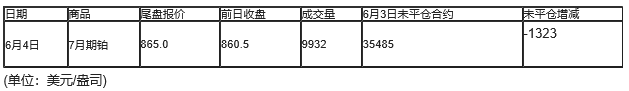 截至北京时间04:59,6月4日纽约商品交易所(NYX)2020年7月期铂成交量为9932,6月4日未平仓合约减少1323手。