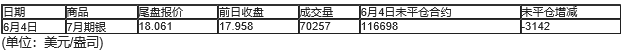 截至北京时间04:59,6月4日纽约商品交易所(COX)2020年7月期银成交量为70257,6月4日未平仓合约减少3142手。