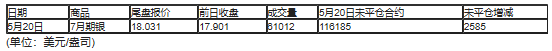 截至北京时间04:59,5月19日纽约商品交易所(COX)2020年7月期银成交量为64725,5月19日未平仓合约增加1995手。 日期 商品 尾盘报价 前日收盘 成交量 5月19日未平仓合约 未平仓增减