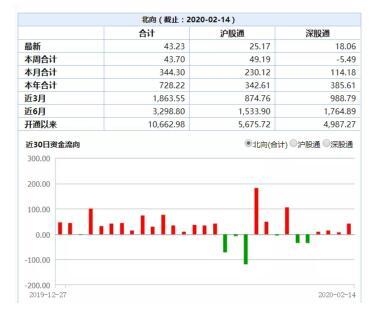 根据Wind数据库统计,北向资金在上周合计流入43.70亿元,其中,沪股通净买入49.19亿元,深股通净卖出5.49亿元。除上周一外,每个交易日的北向资金都呈现净买入状态。数据显示,2月份开市以来,本月北向资金已经合计流入344.30亿元。