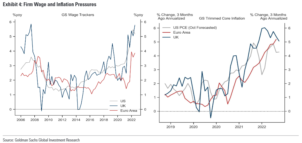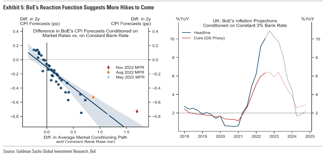 考虑到尽管总体通胀大幅下降,但潜在或核心通胀仍居高不下的担忧,因此,我们通过从英国央行以3%不变利率为条件的总体通胀预测中减去我们自己的总体通胀预测和核心通胀预测之间的差,构建了一个代理核心通胀概况(下图右图所示)。根据这一代理核心通胀情况以及加息与英国央行通胀预测之间的历史关系,我们估计英国央行需要进一步加息约130个基点,才能在2024年底前将11月份的核心通胀预测降至2%。因此,在下周加息50个基点之后,我们继续预计2月将再次加息50个基点,3月和5月将加息25个基点,最终利率为4.5%。